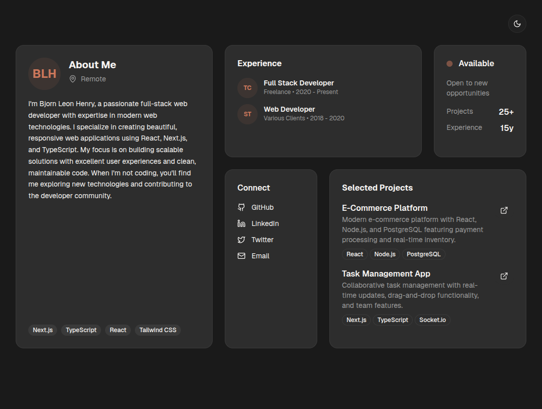 The bento-box layout is achieved using CSS Grid with responsive breakpoints, ensuring the design looks great on all screen sizes. The theme system uses next-themes for seamless dark/light mode switching with system preference detection.